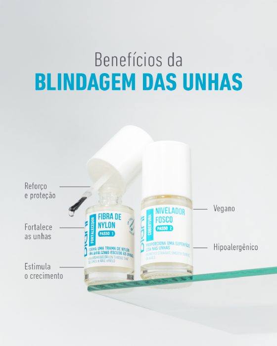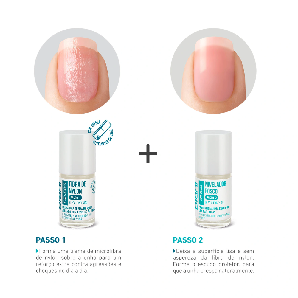 Fibra de Nylon (1º PASSO): Aplique uma camada sobre toda a superfície da unha limpa e seca. Deixe secar por alguns minutos. As unhas ficarão ligeiramente ásperas, com uma trama de nylon visível.
