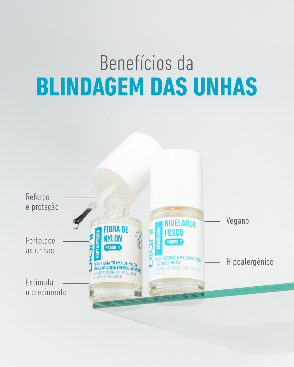 Assim, o Kit Blindagem de unhas proporciona a formação de um escudo capaz de oferecer proteção e máxima resistência às unhas, o que permite um crescimento saudável e evita que elas sofram com qualquer imprevisto, através de 2 passos.