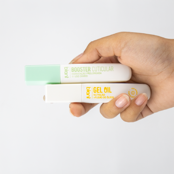 A Caneta Gel Oil promove reposição lipídica e proteção contra o ressecamento, enquanto a Caneta Booster Cuticular atua na retenção de hidratação, regeneração e fortalecimento das unhas.